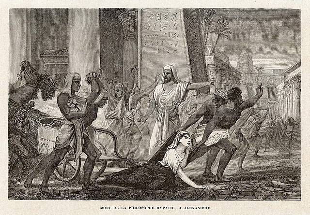 Da quando l’imperatore Teodosio I aveva proclamato il cristianesimo religione unica dell’Impero, il potere ecclesiastico si era radicato nelle città e stava soffocando ciò che restava del paganesimo. In questo clima, nel marzo del 415, una folla di cristiani, forse guidata da monaci detti parabolani, la assalì.